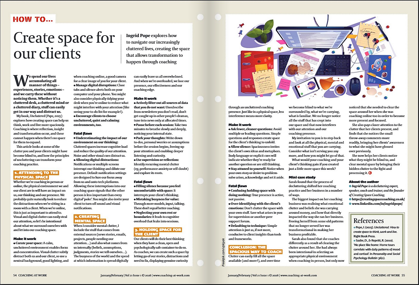 De-cluttering: Creating Space for our clients (Coaching at Work – volume 21, issue 1 – January/February 2026). Read the full article here: